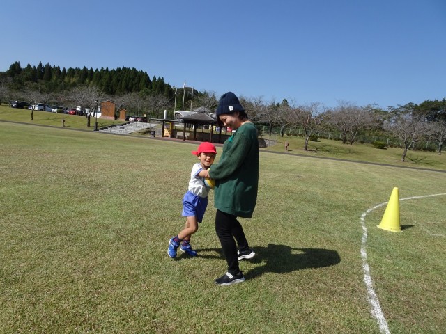 雨天のため、リズム室での遠足でしたが、みんなで、「電車がでんでん」や「ボール転がし」、「お腹のすいたオオカミさんゲーム」などを異年齢で行い楽しく過ごすことができました。