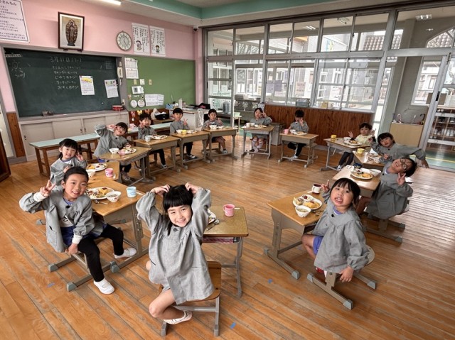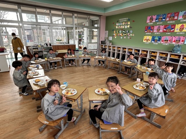 みんなで円になって楽しく給食を食べました。