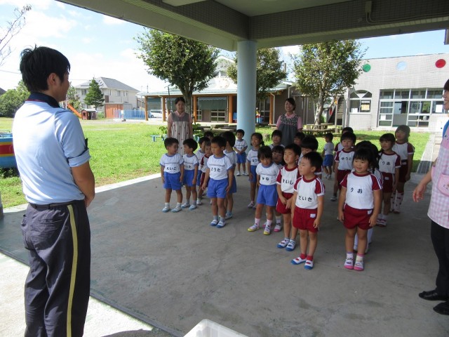 1月25日(木)に交通安全教室がありました。曽於市役所から2名、鹿児島県警から2名の警察官の方と5歳のおまわりさん全ちゃんが来てくださり、1、道路に急に飛び出さない 2、道路で絶対遊ばない 3、車に乗るときはシートベルトカッチンの3つのお約束と横断歩道の渡り方を教えていただきました。笑いを交えながら、分かりやすい説明をしてくださったので子どもたちも楽しくお勉強することが出来ました。